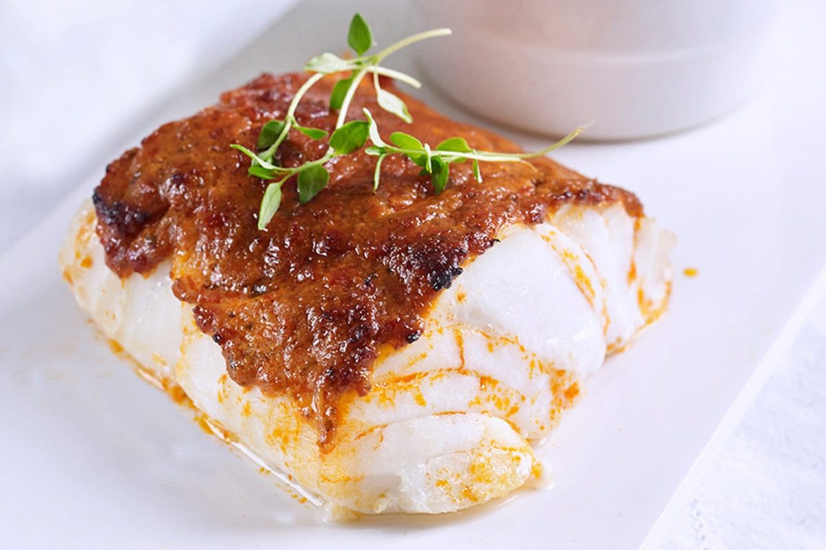 Πέρκα ψητή με κόκκινο κάρυ και λίτσι